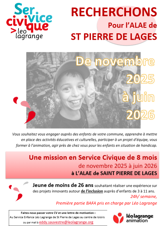 Léo Lagrange recherche un service civique pour l'ALAE de notre commune de novembre 2025 à juin 2026.